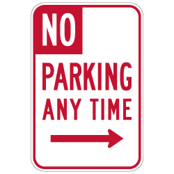 R28 (CA) No Parking Any Time Sign - Right Arrow - 12x18