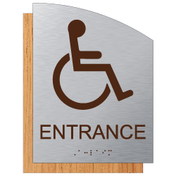 ADA Accessible Entrance Sign - 6.5" x 8.5" - Brushed Aluminum & Wood Laminates | Tactile Text & Braille